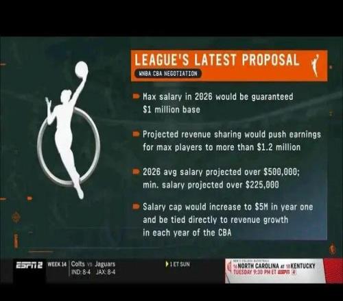 在上周最新一份提案中,联盟提出的最新方案以大幅涨薪为核心:标准顶薪为100万美元,通过收入分成机制最高可达120万美元;平均年薪大约为50万美元,最低年薪则在22万左右。这些数字,远远高于目前的水平。现在WNBA的底薪、平均薪资和顶薪分别为:6.6万美元10.22万美元、和24.9万美元。