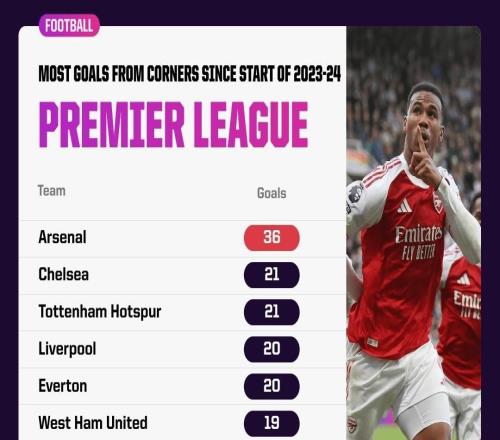 阿森纳前6轮拿45个角球英超最多,近三个赛季通过角球进36球
