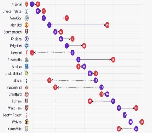 数据机构公布英超前6轮期望排名:利物浦排名第八,曼联第四
